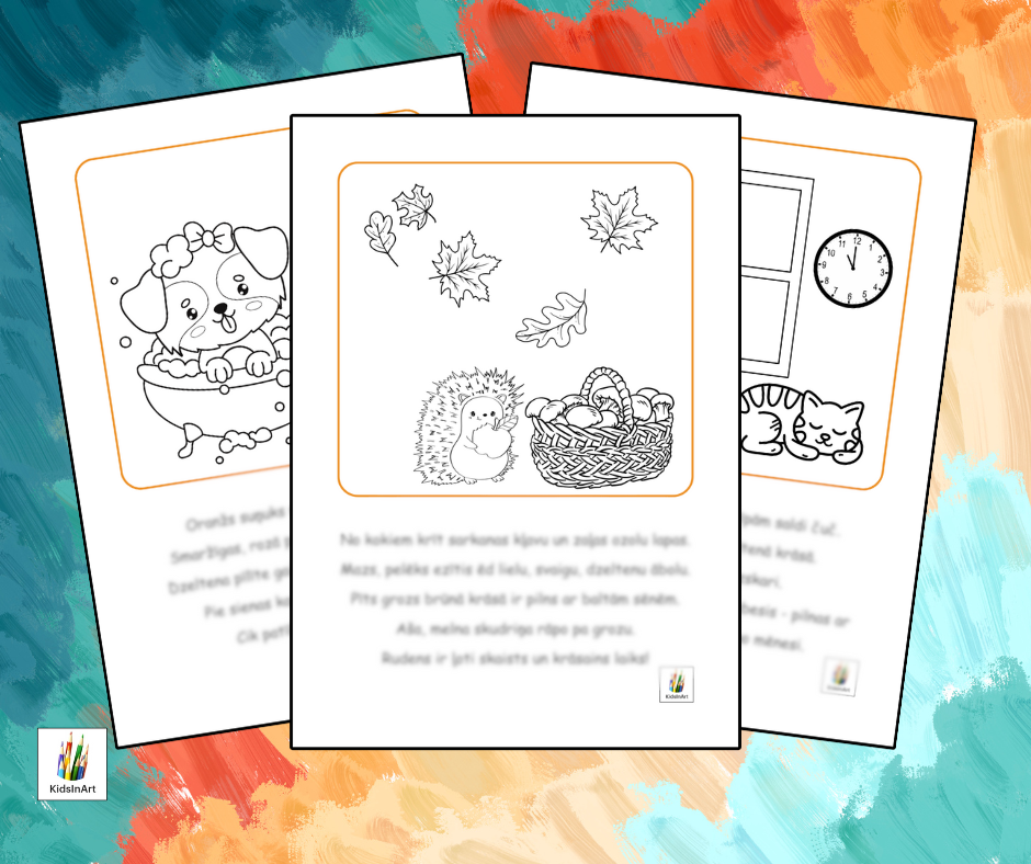 📎Lasi īsus tekstiņus, krāso ilustrācijas un piezīmē trūkstošo.
